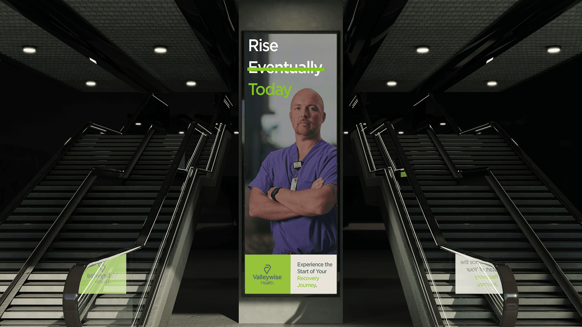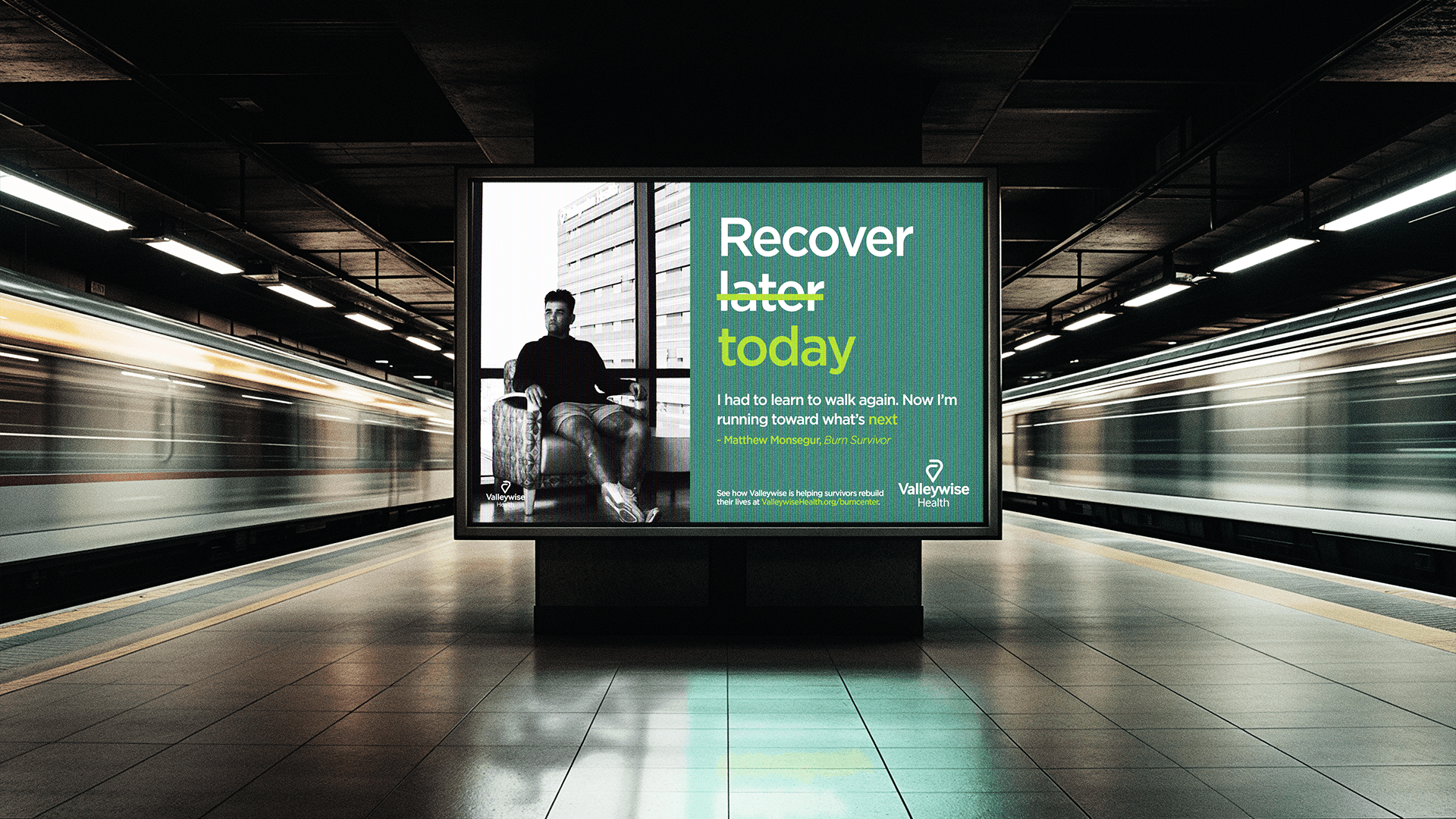 Better L̶a̶t̶e̶r now was the response. The campaign name flipped the idea of “healing takes time” on its head, challenging viewers to act now, because time is something burn survivors can’t afford to wait on. We used crossed-out phrases like “Stronger E̶v̶e̶n̶t̶u̶a̶l̶l̶y Now” and “Rise E̶v̶e̶n̶t̶u̶a̶l̶l̶y Today” to visually interrupt the status quo and draw people in. Through storytelling, bold design, and strategic placement, we built a world where urgency meets hope, and where people could see themselves not just as bystanders, but as part of the solution.